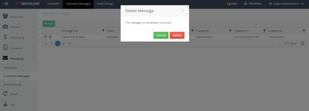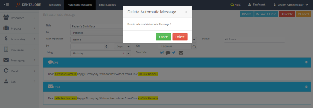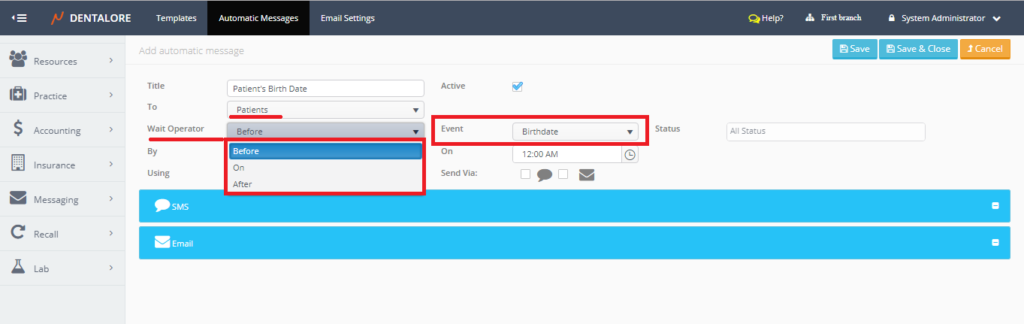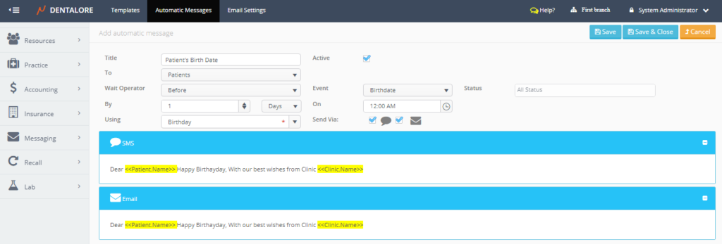 From Dentalore Cloud System user has the ability to configure many different rules that automatically manages the sending of messages (SMS and/or Email) to patients upon configured settings.
