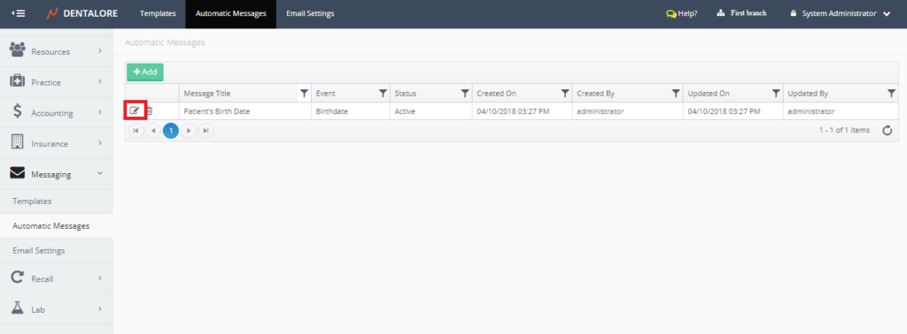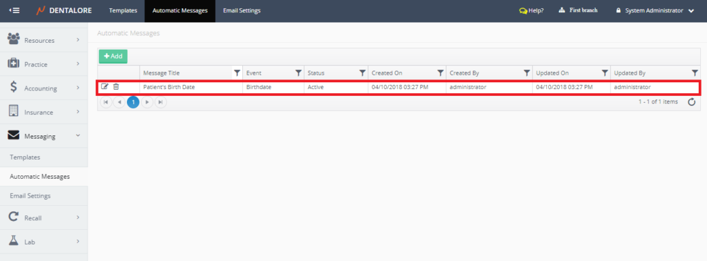 - Automatic Messages main page opens displaying all of the defined automatic rules and an "Add" button to add new automatic rule.