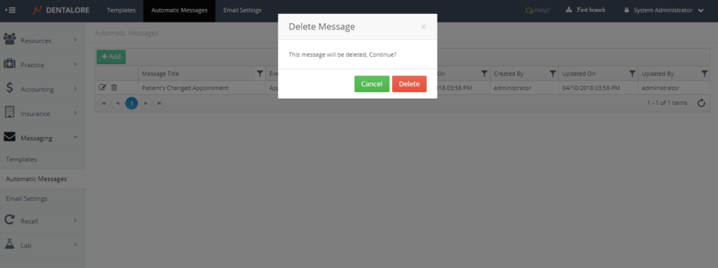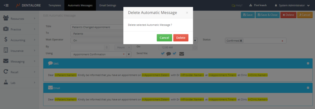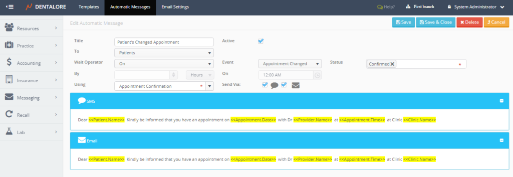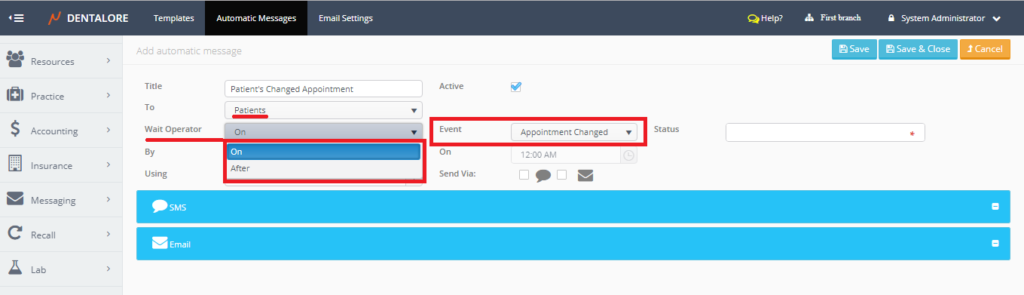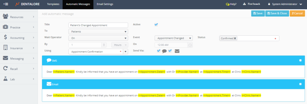 From Dentalore Cloud System user has the ability to configure many different rules that automatically manages the sending of messages (SMS and/or Email) to patients upon configured settings.