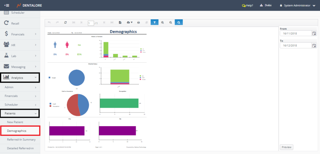 - The bar chart displays the total number of all patients whose marital status are displayed in pie chart, according to their gender within the selected date range.