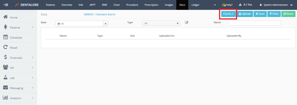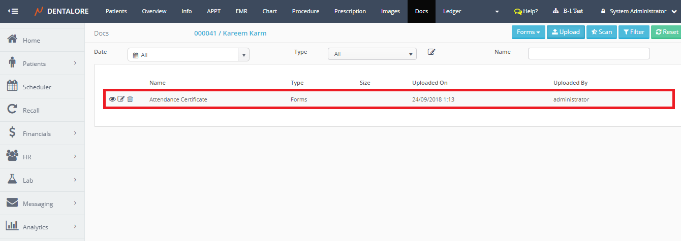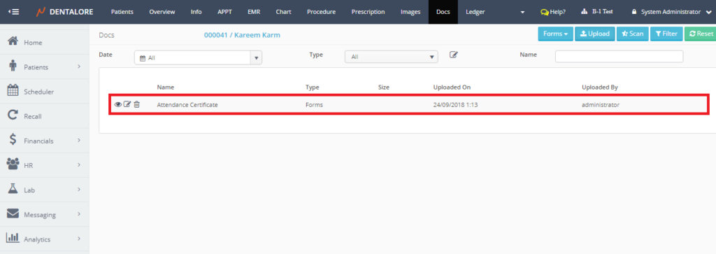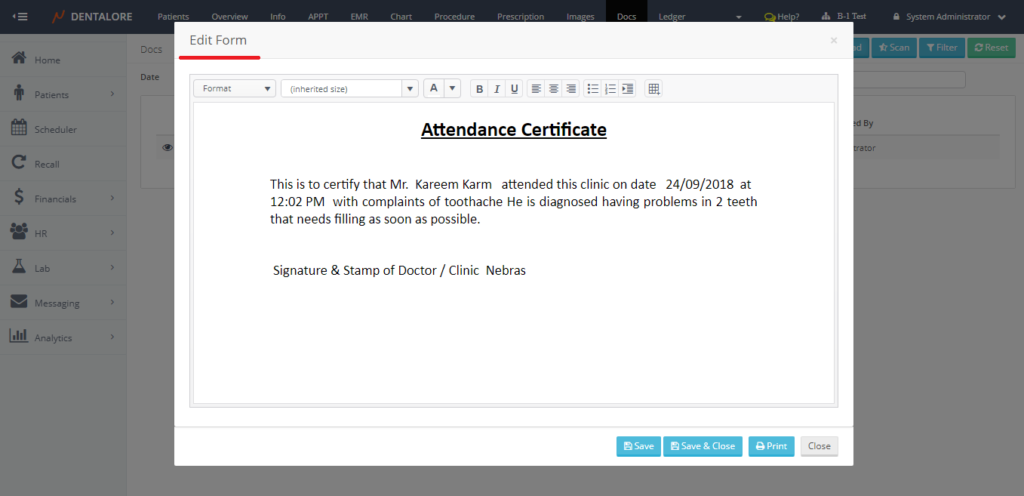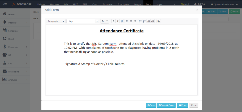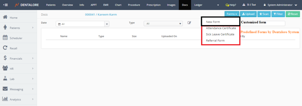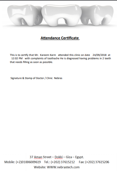 Forms are templates that are predefined by Dentalore system or configured by user in order to have ready forms to be created for patients and added in their files on any time, such as the Attendance Certificate which proves that the patient was in the clinic within a specific time, Sick leave certificate, …etc.