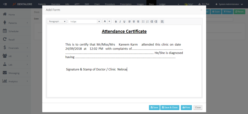 - From the “Add Form” Popup user could edit in the form as required, save and print the form.