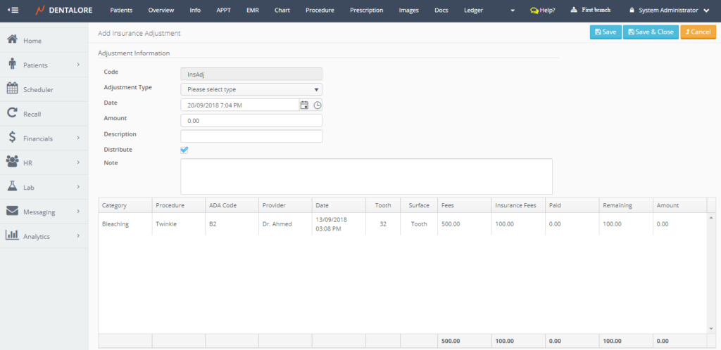 - Code: Is a code (InsAdj) related to the Insurance adjustment transaction which is automatically generated by Dentalore system and can't be edited by user.