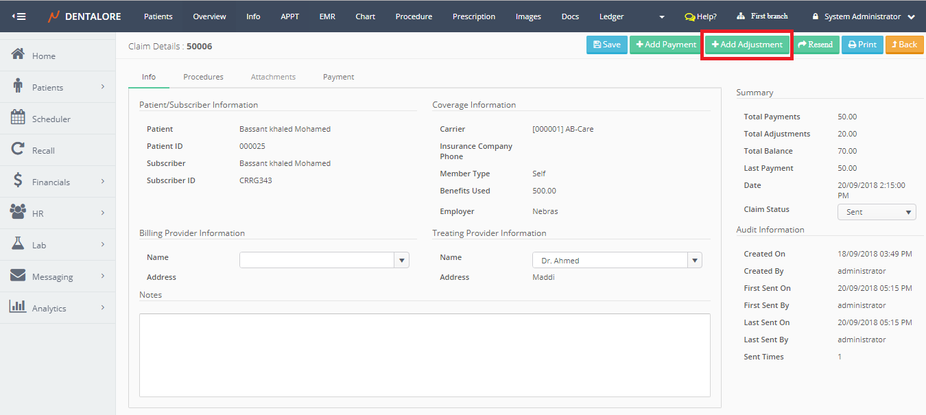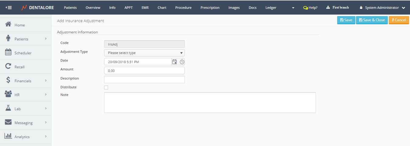 - Code: Is a code (InsAdj) related to the Insurance adjustment transaction which is automatically generated by Dentalore system and can't be edited by user.