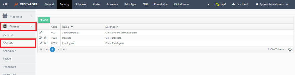 Each user created in Dentalore cloud system could have access rights that enables him/her to manage his work through them. So users should be added to security groups that manages these access rights and by default Dentalore System offers 3 predefined security groups to fulfill this requirement. As well admin has freedom to add users in one of the predefined groups or create new security groups with required access rights upon clinic’s needs.