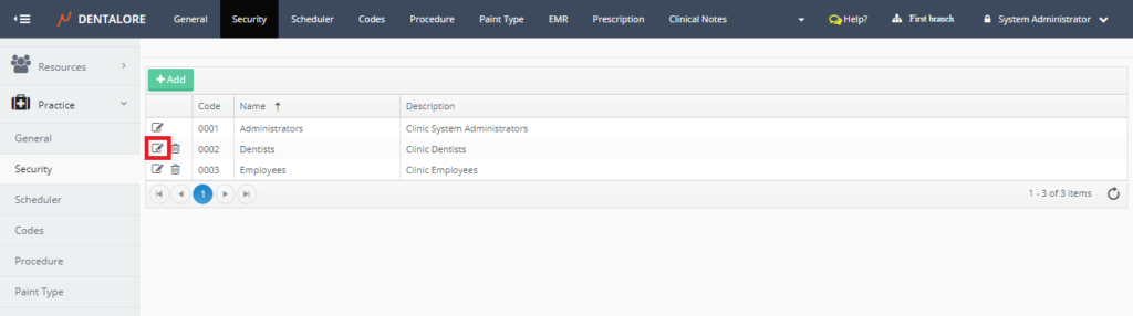>> By default the 3 defined security groups by Dentalore system are displayed in the ‘Security’ main page. - For the (Providers) Select the security group named (Dentists) that has already selected features that always used by providers in the clinics.