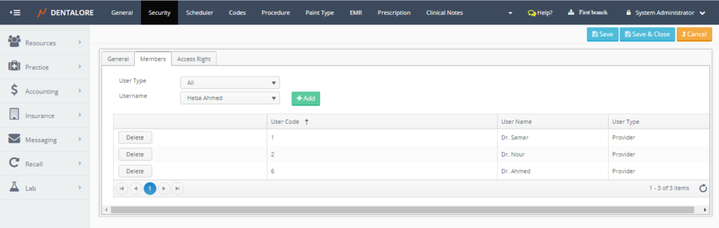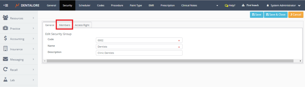 - As well Admin could manage the Access rights given to the selected group from the (Access Rights) tab, For more information, Check: Access Rights for Dentalore System.