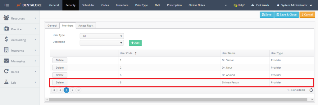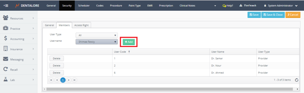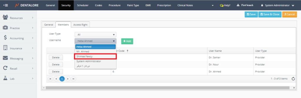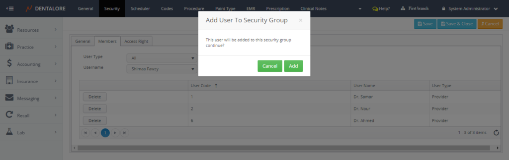 - From the (Username) drop down menu select the name of required provider to be added in the (Dentists) security group.