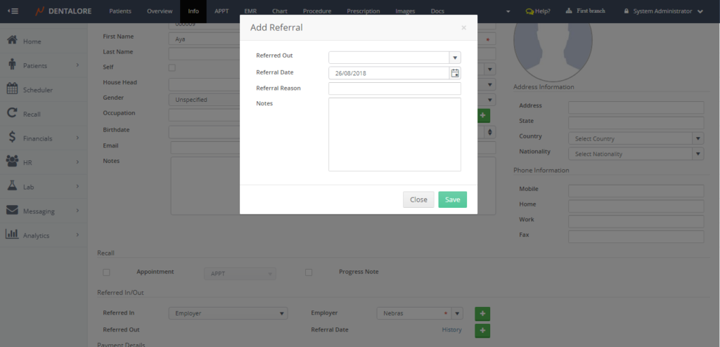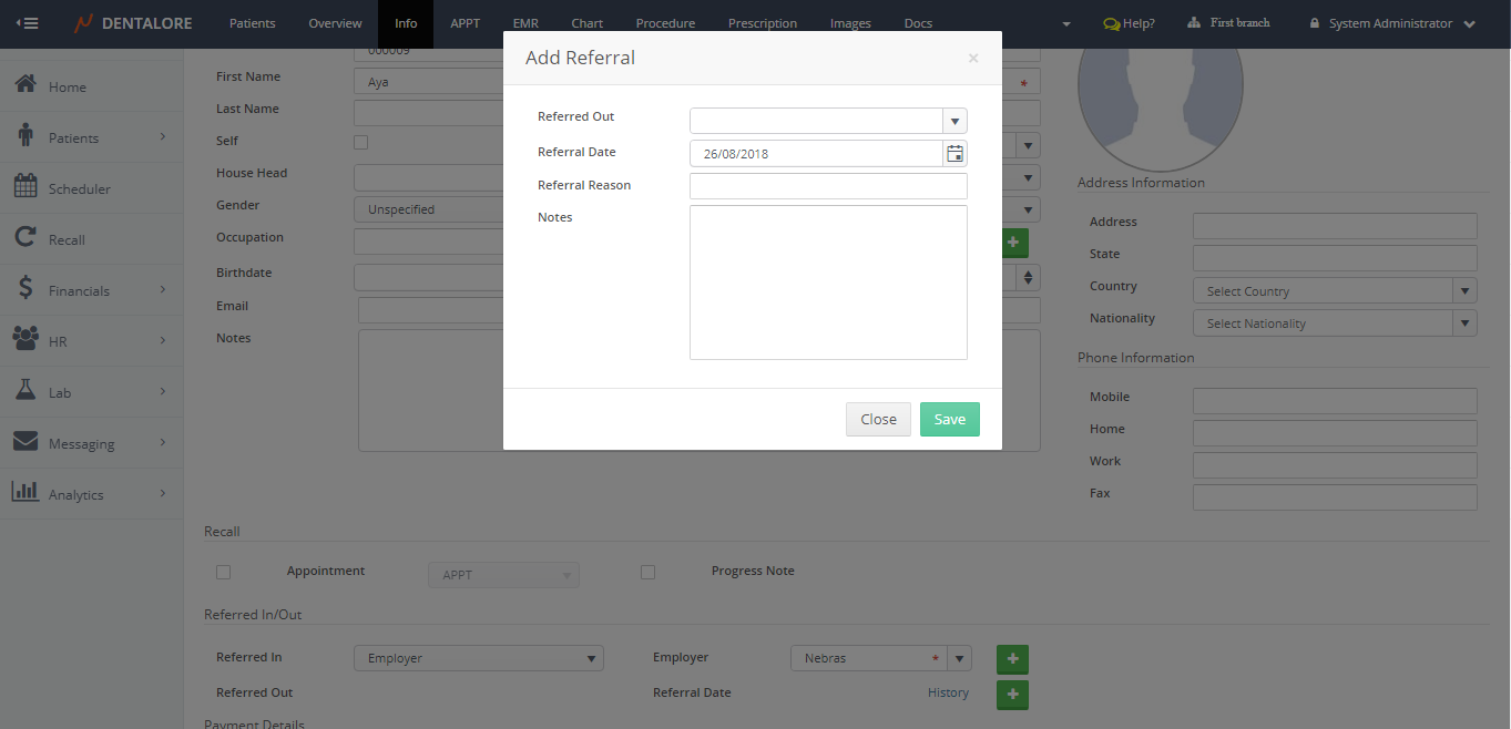 — Save button: When pressed, the popup closes and a referred out has been saved for this patient. - From the “Add Referral” Popup add a referred out and save.