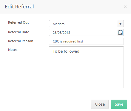 — Close button: When pressed, the popup closes without saving the new data of referred out.