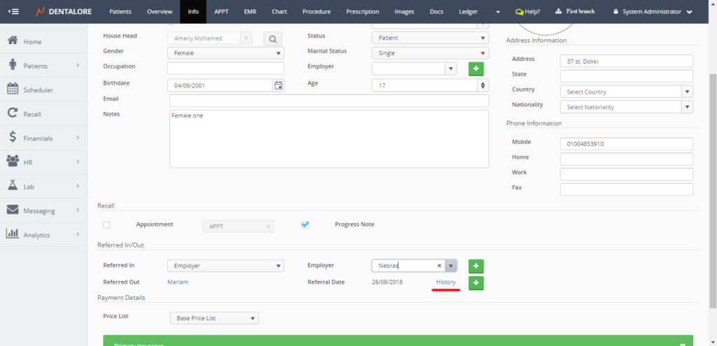 Moreover the “Referred Out” has an “History” option that enables user to display all of the referred out actions done for the selected patient.