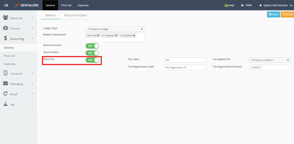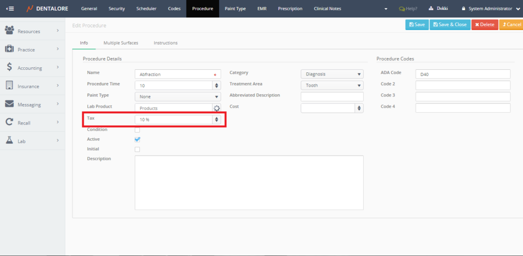 Each procedure can have their own taxes percentage assigned to it from settings.