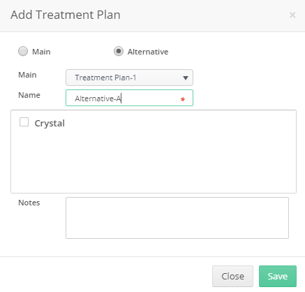 — “Save” button: Once Pressed, Popup closes and alternative treatment plan added under the selected main treatment plan. - Add the “Alternative” treatment plan and save.