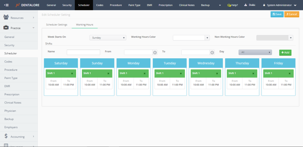 - Select All from day list box if you want to add these hours to all days or select specific day and press Add button and press Save