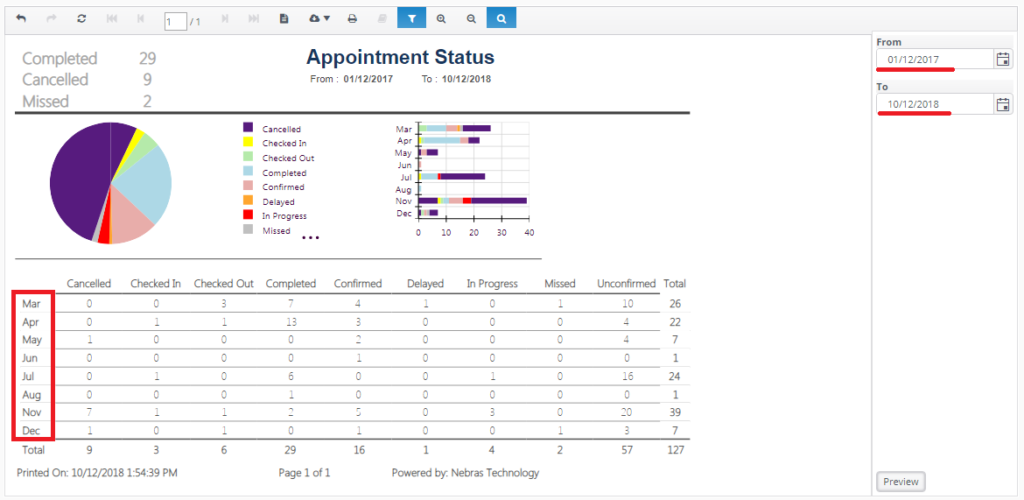 1. Displays different appointment statuses in the selected branch of your clinic from the navigation bar within specific date range.