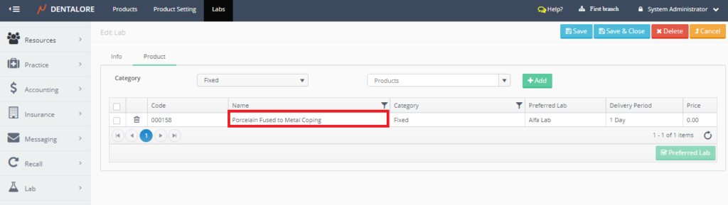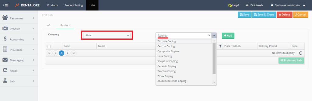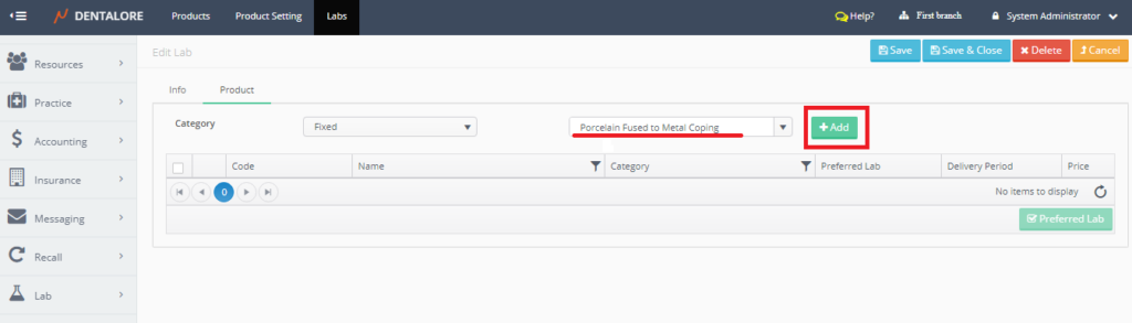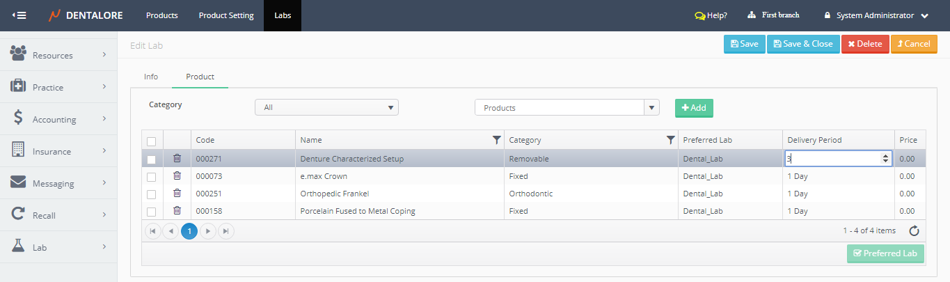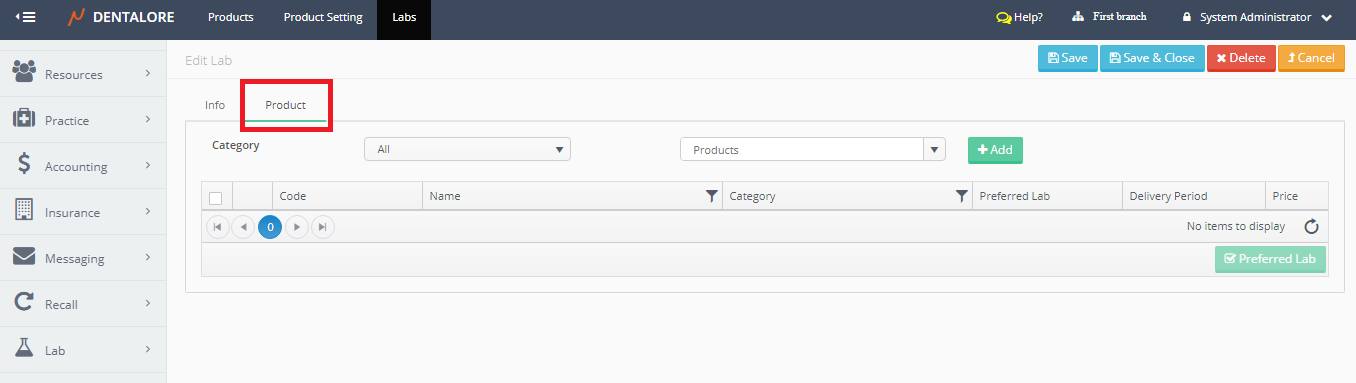 DentaLore Cloud System gives the user ability to add products to a specific lab from different views. One of these views is to add products form (Products) tab in the “Edit Lab” page.