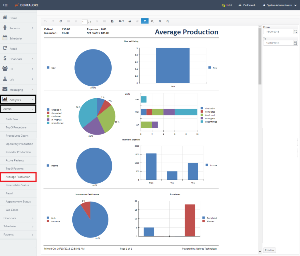 - Info of patients displayed in report are divided in to 5 Sections: (New Vs Existing, Visits, Income Vs Expenses, Insurance Vs Cash Income and Procedures).