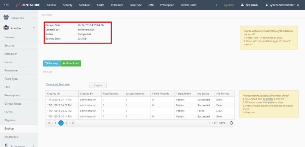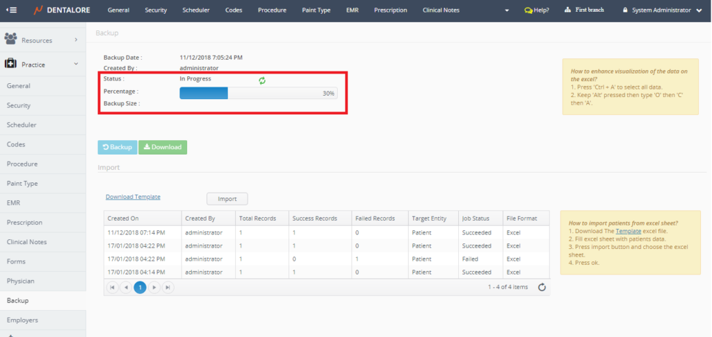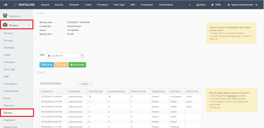DentaLore System offers one of the most important features in any cloud software system which is the ability to take a backup of your data, downloading it on your computer and also importing new data to the system.