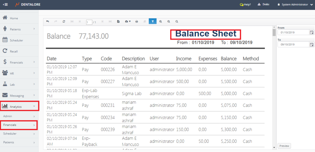 – Date filtration depends on the Financial Transaction Date of each of the Patient Payment, Insurance Payment,Payback,Lab Expenses and Expenses.
