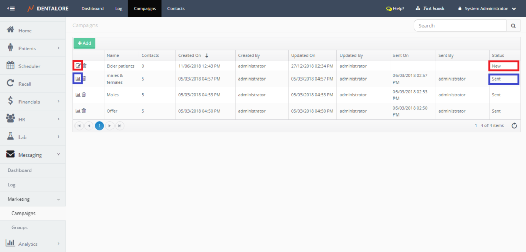Messaging Module in DentaLore offers user many functions that help him to send messages (SMS abd/or Email) to patients, Track these messages, Create campaigns and Create groups to sent campaigns for.