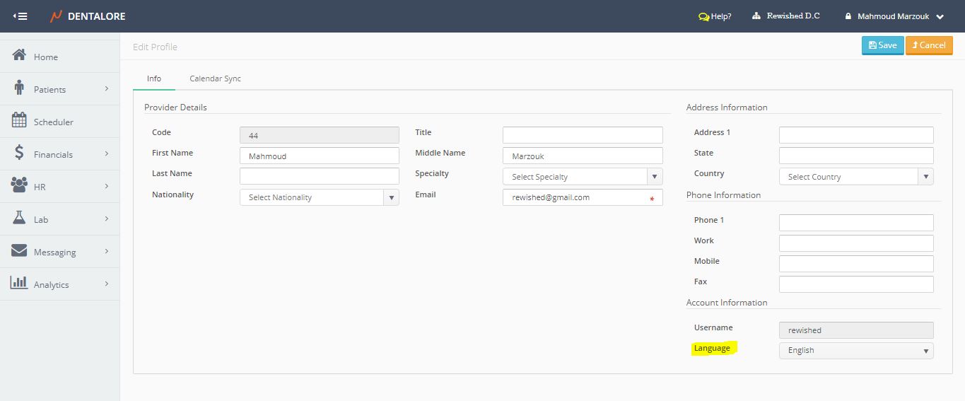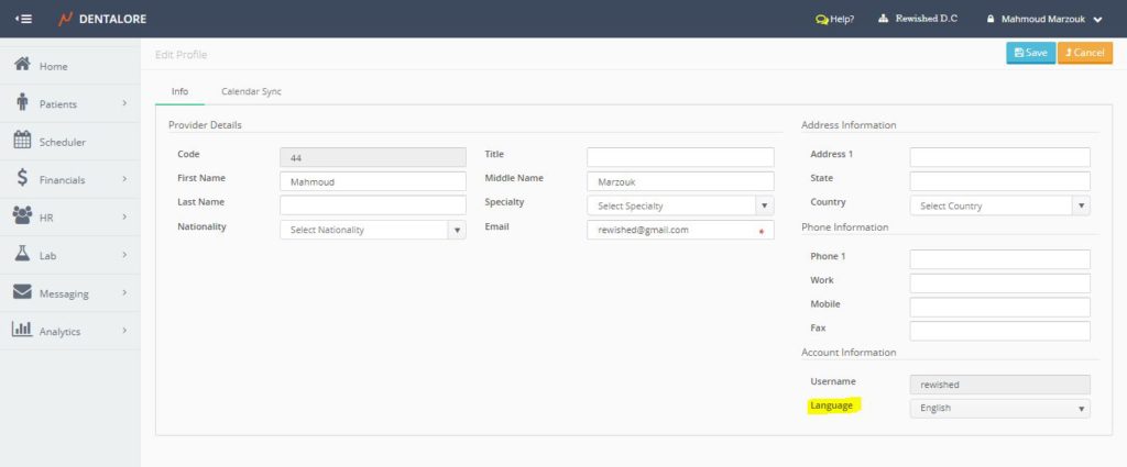 Change Language Created: 11/05/2018 / Author: nebras-dentalore Press on Your Name on the upper right corner Press My Profile Choose Language Then Click Save