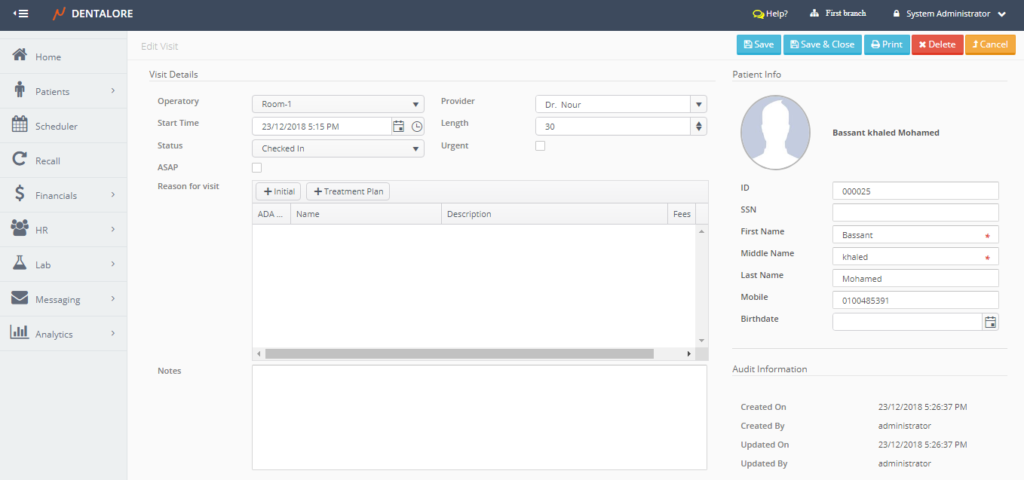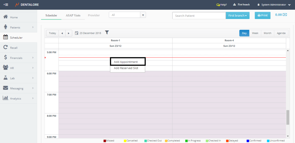 DentaLore system offers the user many views that enables him/her to add visits (appointments) for patients, the main view for doing this, is the scheduler Module.