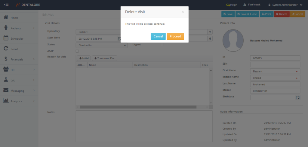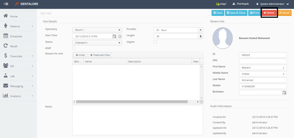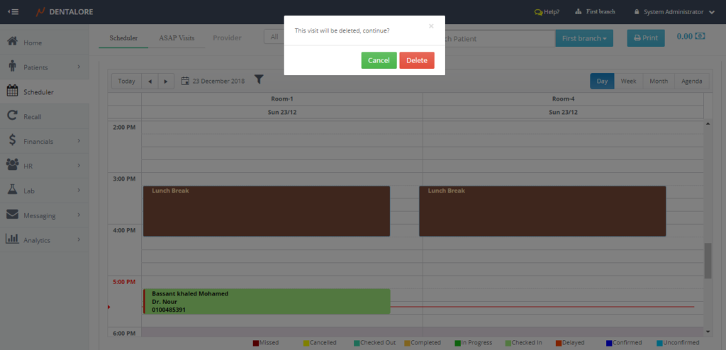 If user Press "Delete" then the visit will be deleted and removed from the patient's visits and from Scheduler View.