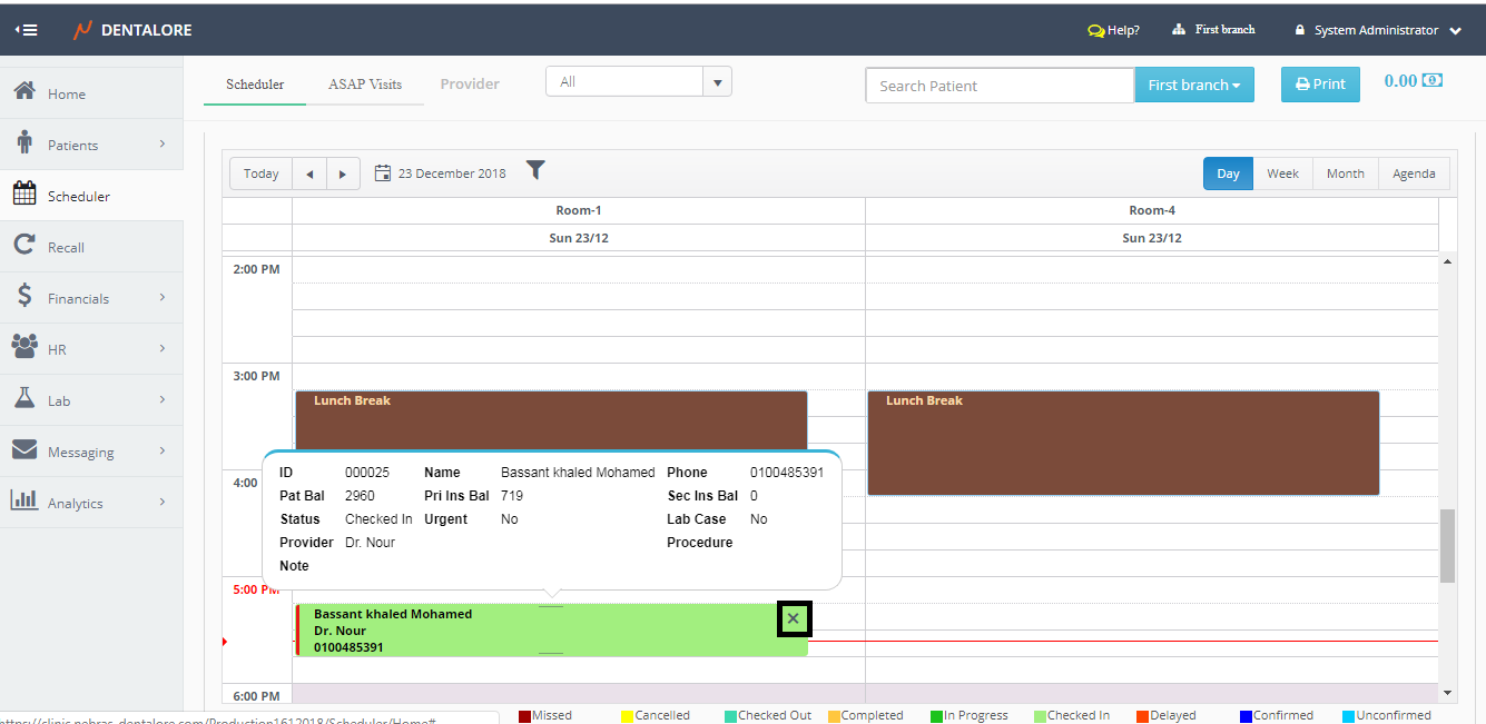 DentaLore system offers the user many views that enables him/her to add visits (appointments) for patients, the main view for doing this, is the scheduler Module.