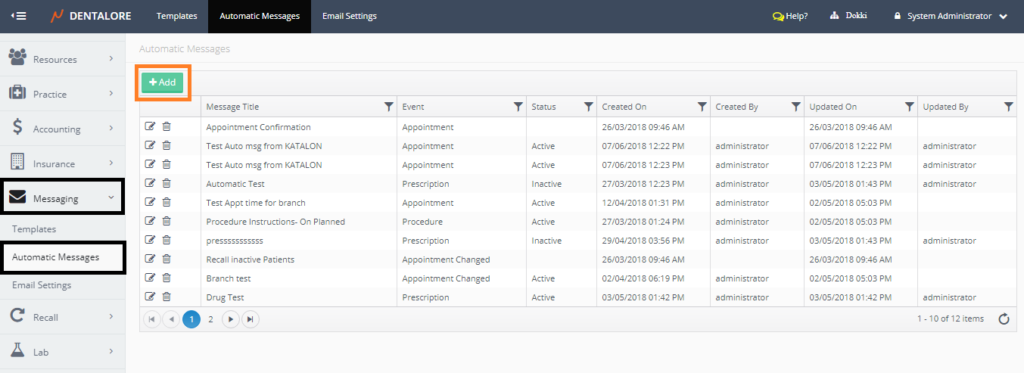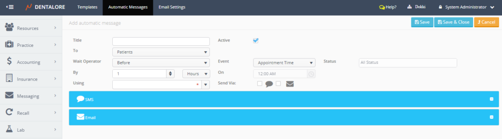 Dentalore cloud offers you the ability of automatically sending messages (SMS and/or Email) to your patients once starting, during or after ending procedures.