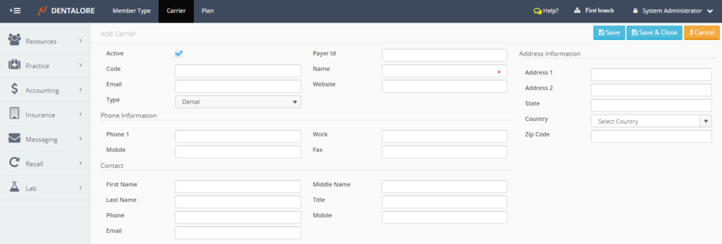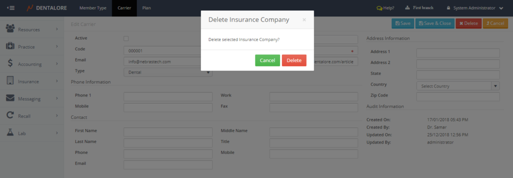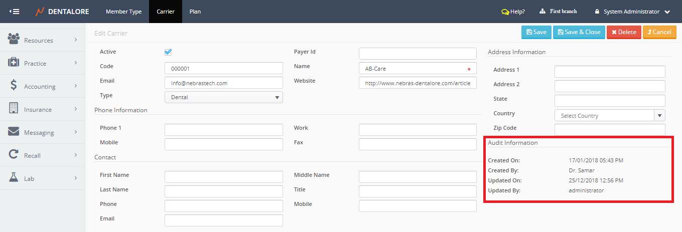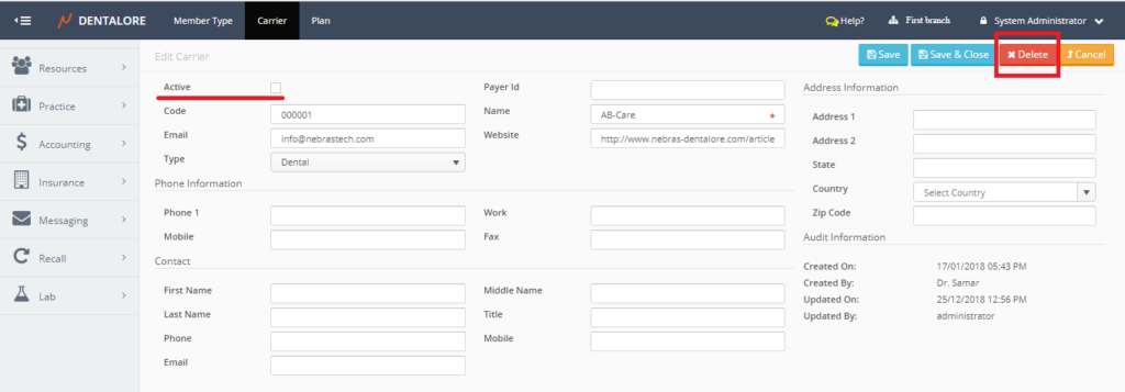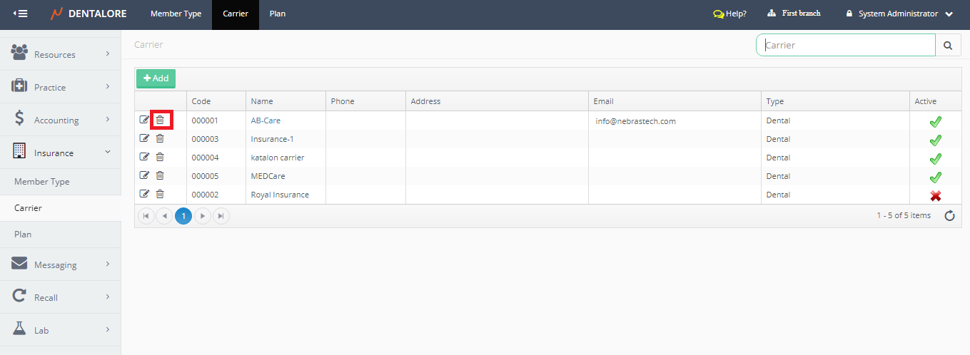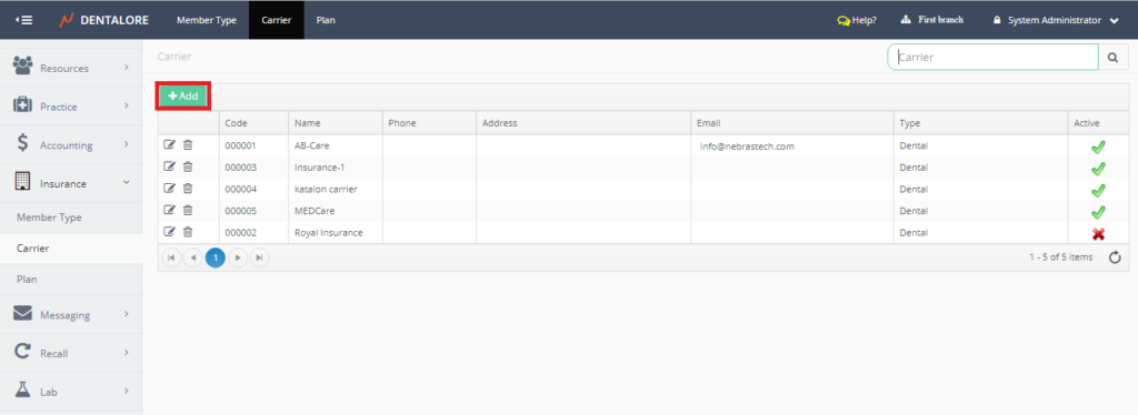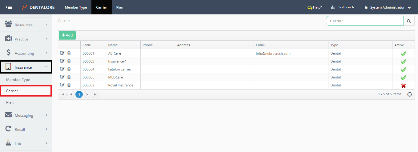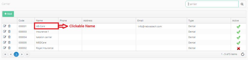 Carrier main page includes a grid view that lists all of the defined carriers all over the clinic (For all Branches).