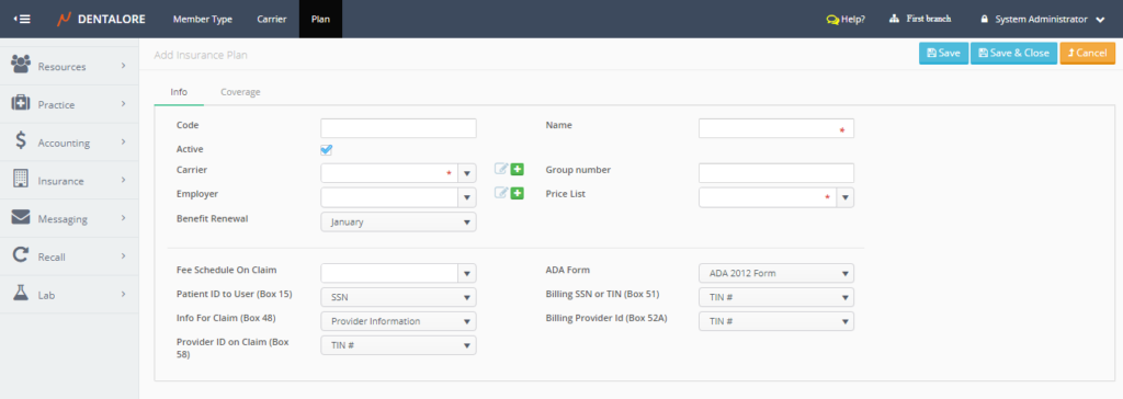 - The "Add Insurance Plan" page mainly has 2 tabs: Info and Coverage to manage the coverage ratio for each procedure. The Coverage tab is disabled until the plan is created.