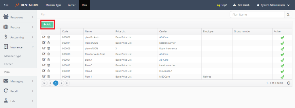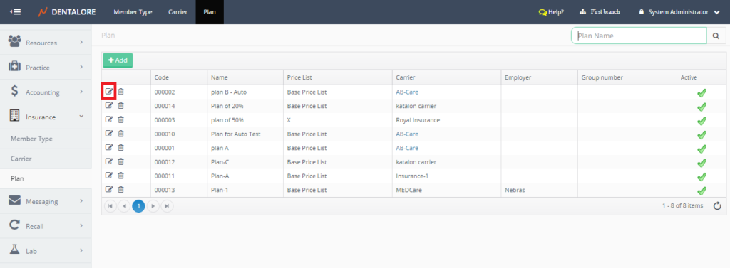 -- Is a check box that's ticked by default, which means that the plan is active and could be selected for usage for patients. While when check box is Not ticked that means the plan can't be used.- Carrier