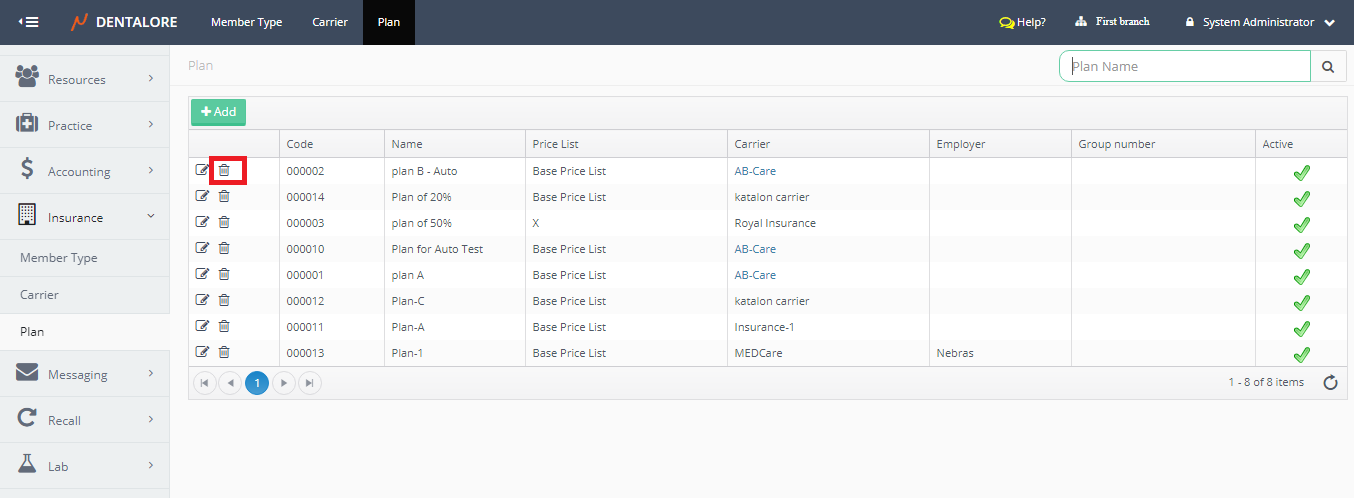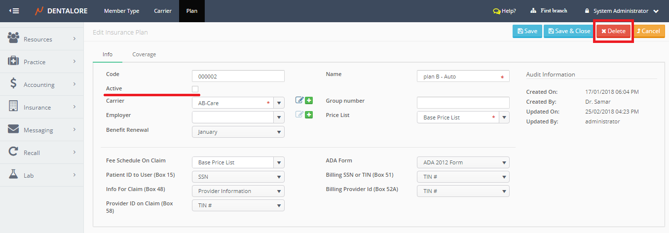 - If user press "Delete" then the plan will be deleted and removed from the plan grid view.>> Note that in order to be able to delete an insurance plan then this plan must be "Inactive". Otherwise it will not be deleted.