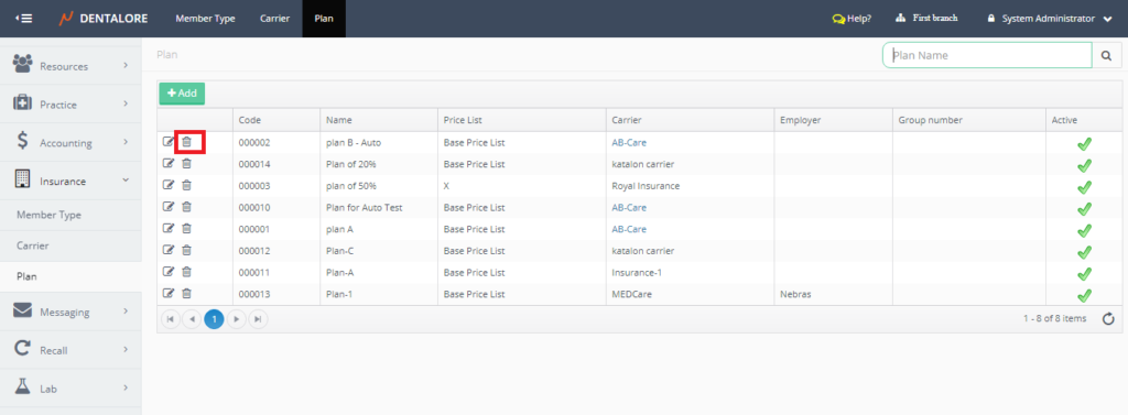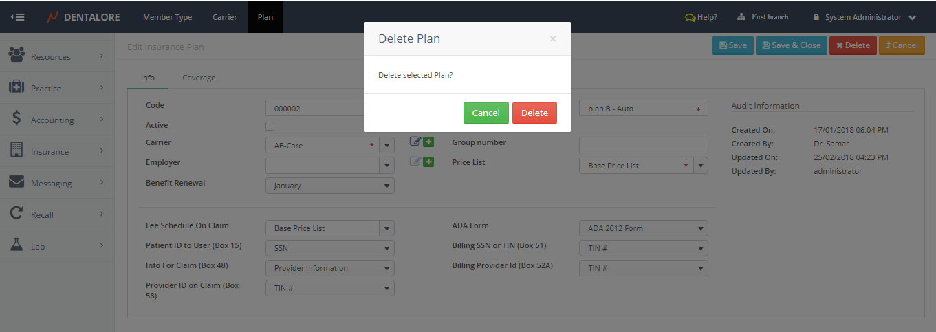 - Press "Delete" button in the 'Edit Insurance Plan' page.