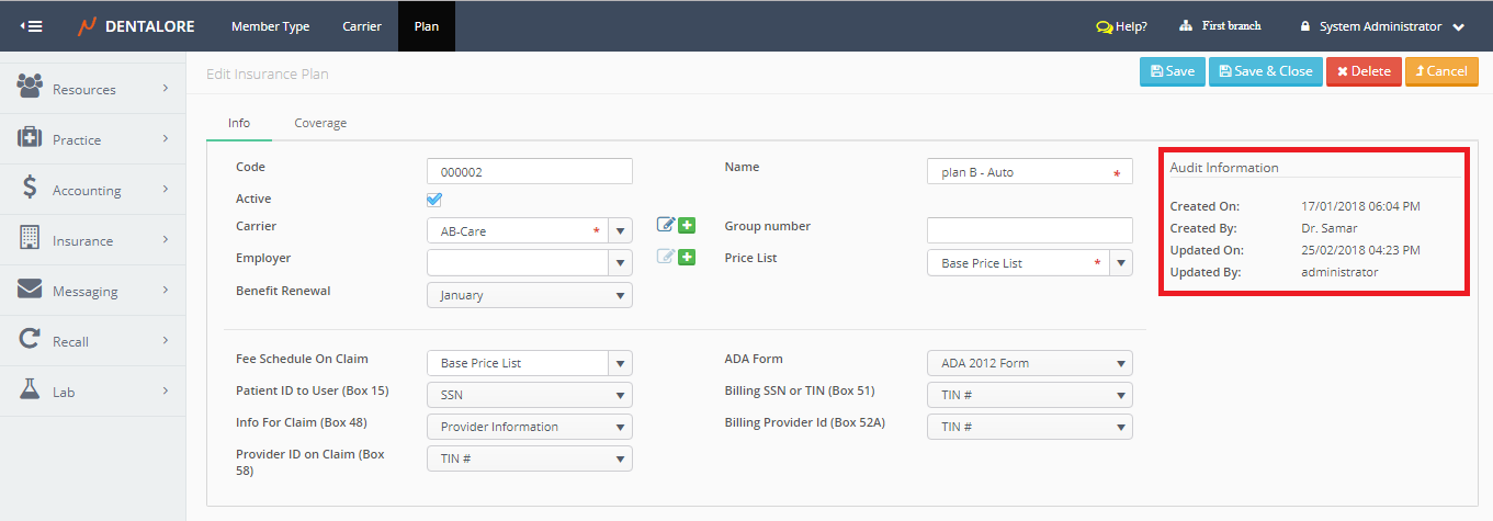 - After saving the Plan, The (Coverage) tab becomes enabled and New Section "Audit Information" section displayed in the 'Edit Insurance Plan' page that displays the following: