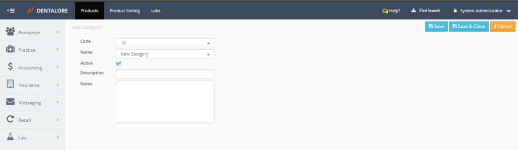 — Notes: Field to write notes upon request. - Fill in mandatory and required fields and save the new category.
