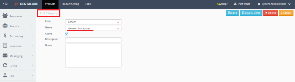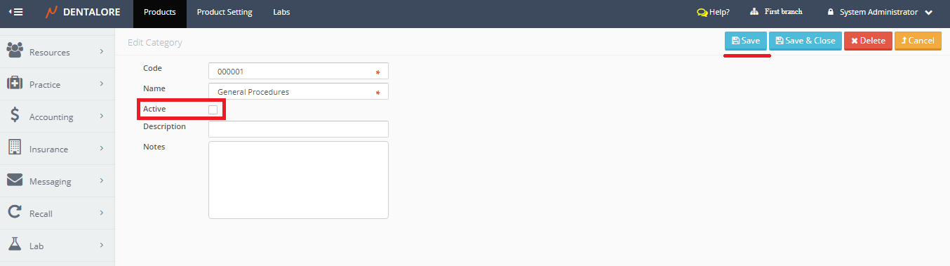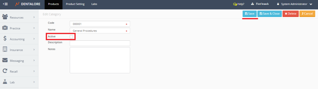 — Active: Is a check box that’s ticked by default that means this procedure could be used and add lab product items to be listed under it.