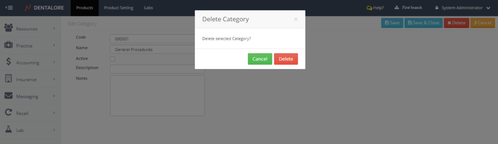 Note that: To delete a Lab Product Category, you must first delete all Lab Product items included in this category. If you delete a category that includes Lab Products then the following message will appear “This Category has one or more related products and cannot be deleted“.