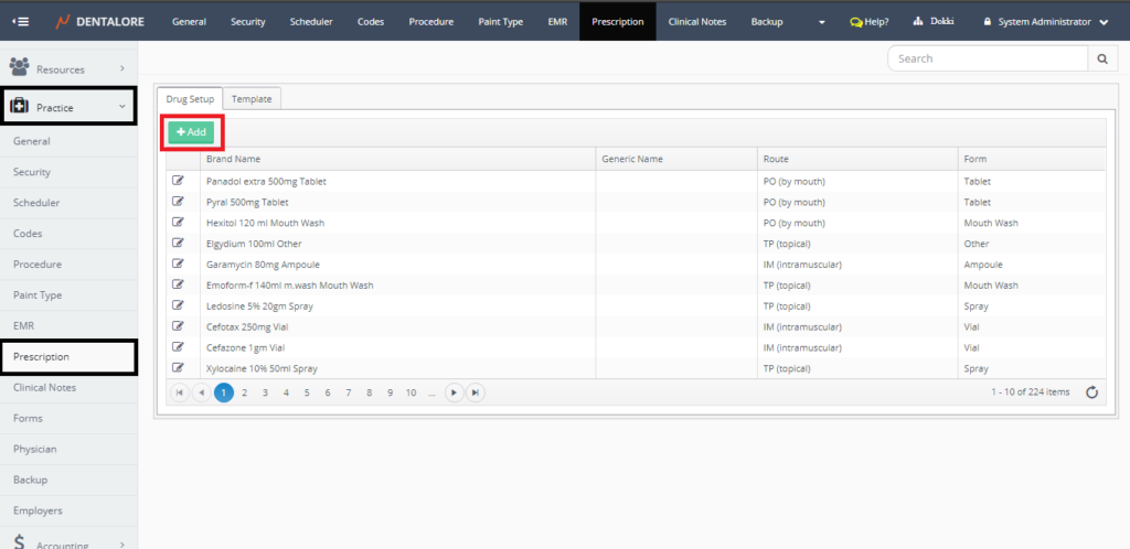 • From the “Drugs” tab that opens by default after selecting “Prescription” sub module. Press the “Add” button.