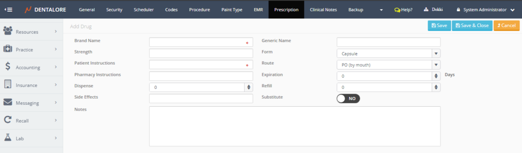 — “Save and Close” button: Will save the new drug and user will be directed to the main prescription page that contains the “Drugs” grid view.