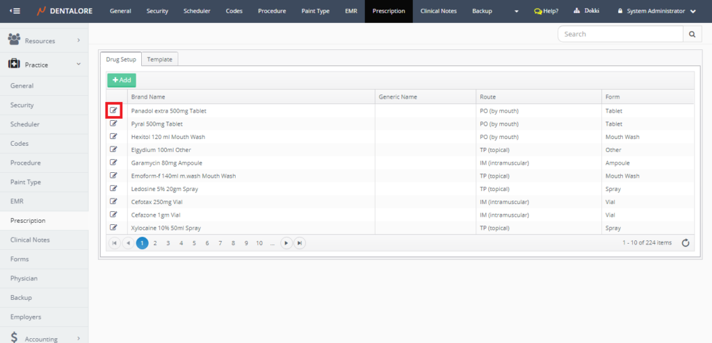 • From the “Drugs” tab that opens by default after selecting “Prescription” sub module. Press the “Edit” icon.