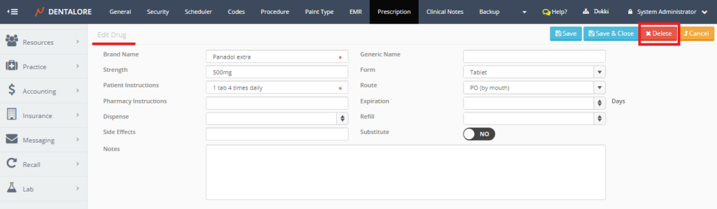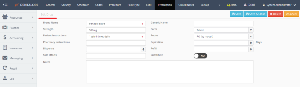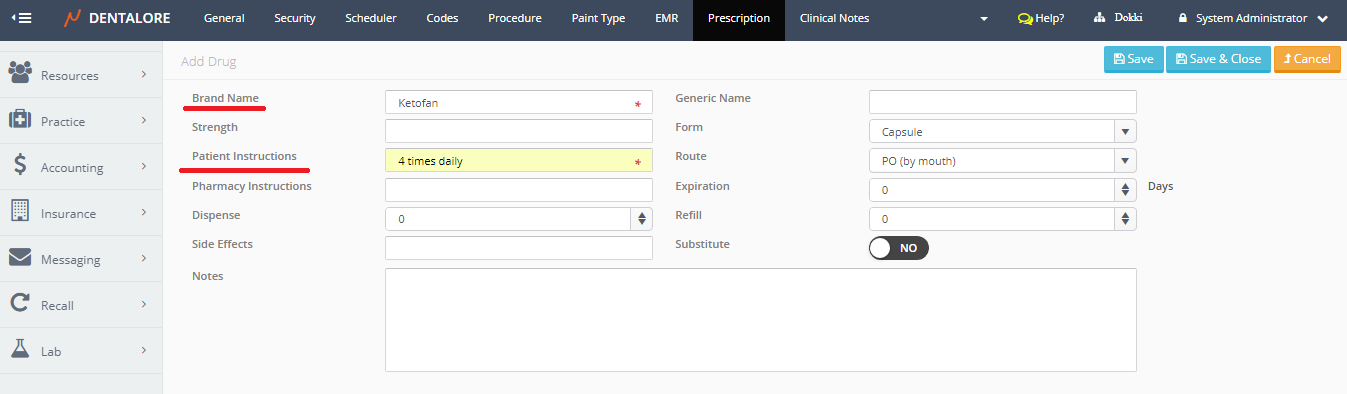 • While adding a new drug, insert the mandatory fields (Brand Name and Patient Instructions) to be able to save the drug.