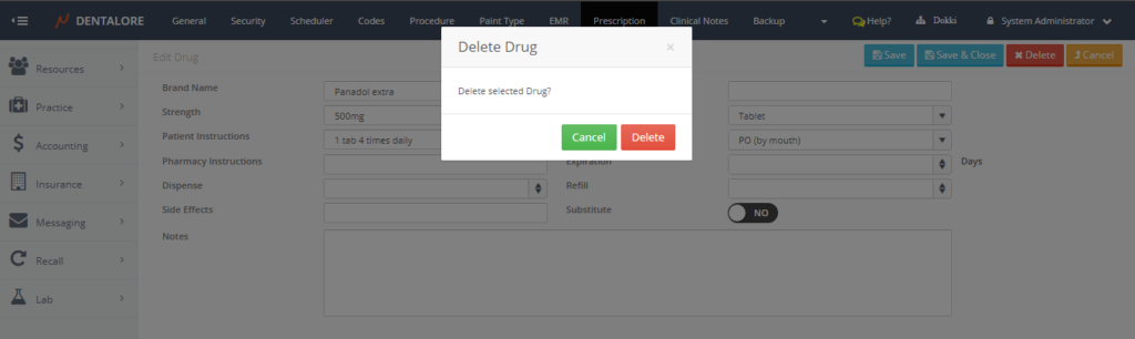 • Popup “Delete Drug” opens, Press “Delete” button to directly delete the drug. If user press “Cancel” then drug will not be deleted.