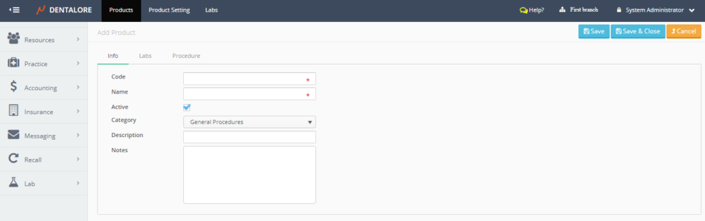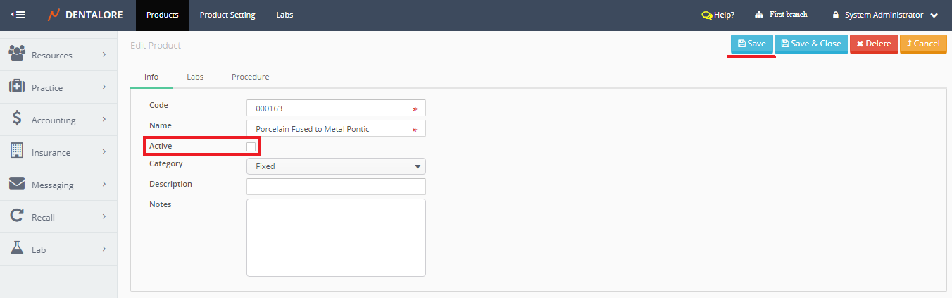 — Active: Is a check box that’s ticked by default that means this procedure could be used and add lab product items to be listed under it.