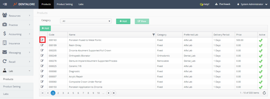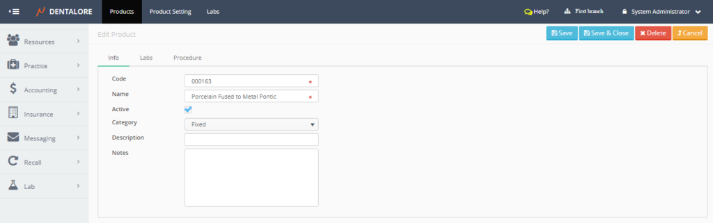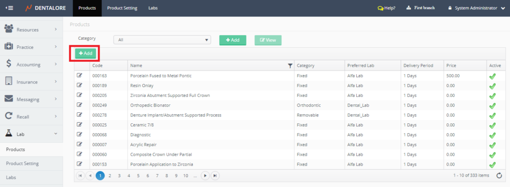 For the lab product items in DentaLore Cloud System there are already defined products organized by categories that each category includes some of the products that you can directly use them and as well you have the ability to add new main category and add products to this new category or add new lab products under any of the existing categories.