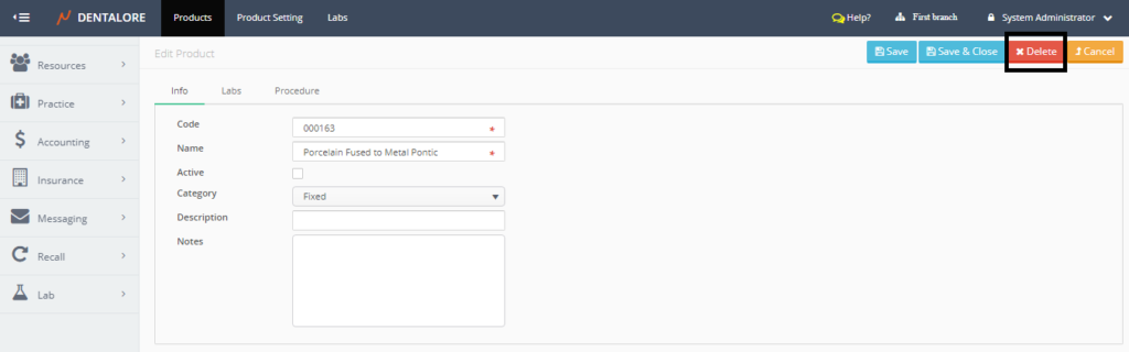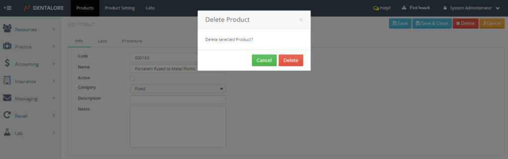 - If user press “Delete” button then the selected lab product will be deleted and removed from ‘Products’ grid view. If user press “Cancel” button then the selected lab product will not be deleted and still could be used.
