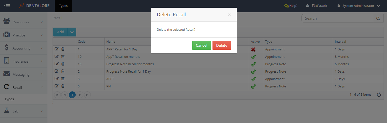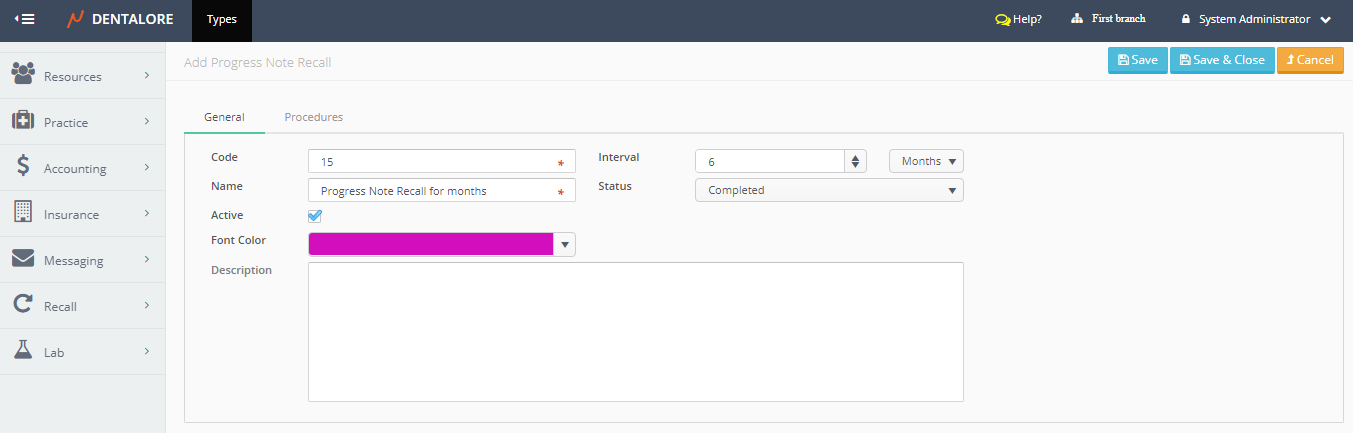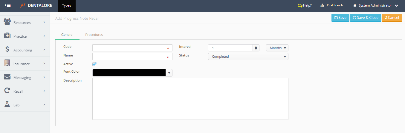— “Cancel” button: New “Progress Note” recall will not be saved and user will be directed to the “Recall” main page. - Insert the mandatory fields (Code & Name), Select interval required, and save.