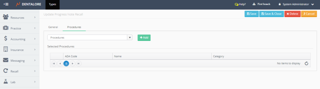 - After saving the “Progress Note” recall, the (Procedures) tab will be enabled in order to select the required procedures in which the recall will work for them.