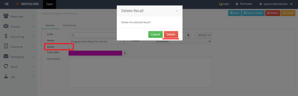 - >> Note that in order to delete any recall, this recall must be of status “Inactive”.