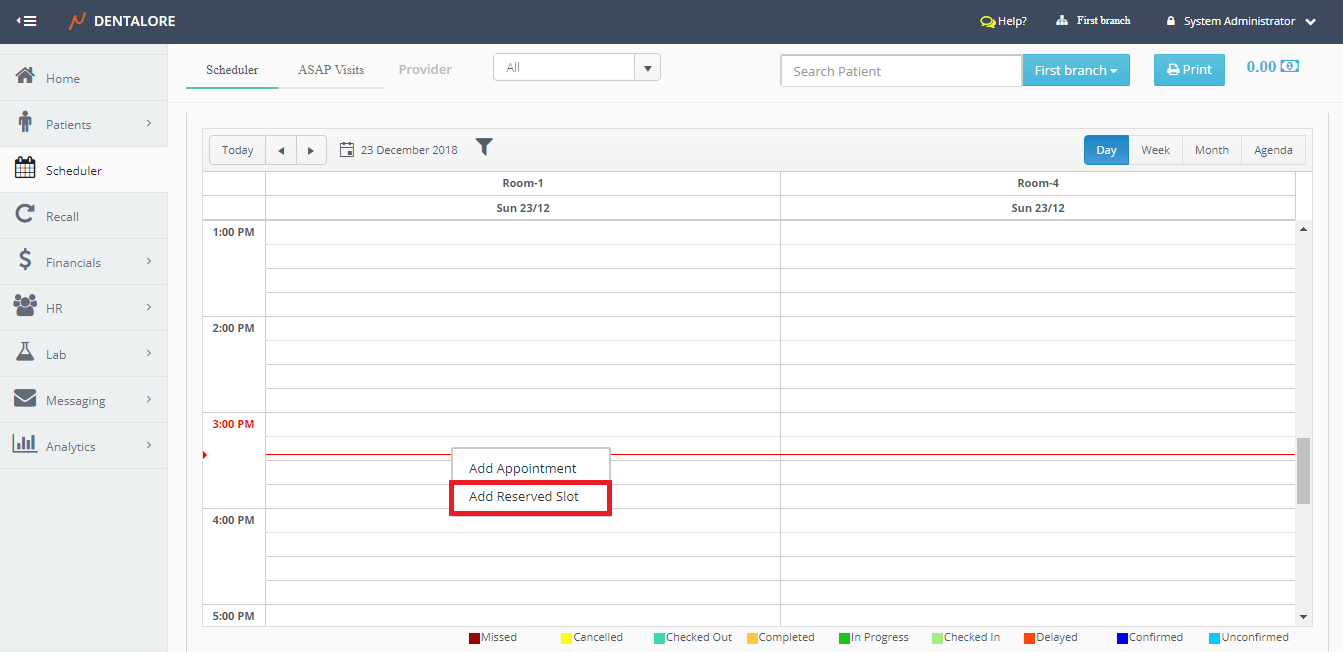 • Right Click on required slot on the scheduler; Short cut menu opens that contains 2 options: (New Appointment and Reserves Slot).